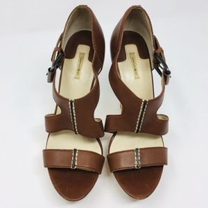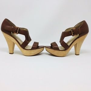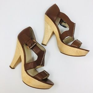 MAX STUDIO Camel Brown Leather Strappy Platform Boho Light Wooden Heel