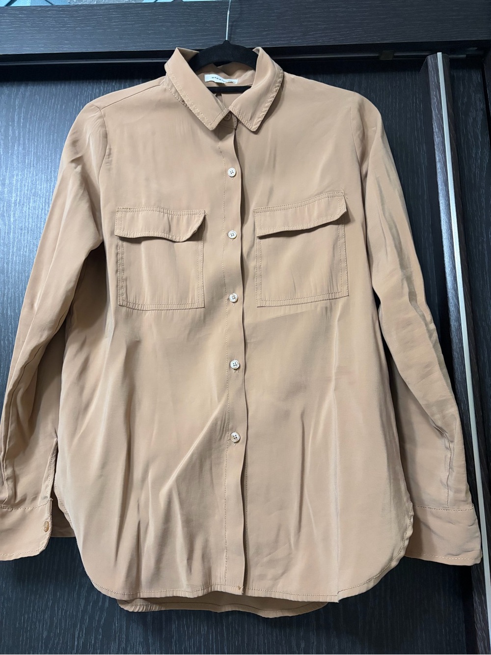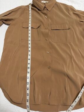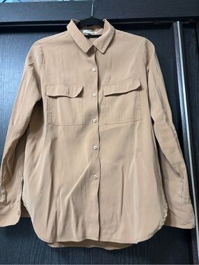 Classic collared shirt with neat topstitching. Button-front closure and crisp collar. Smooth fabric with a warm tan hue.