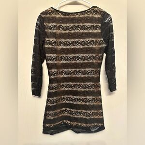 Elegant Max Studio lace overlay top, size Small. Features a nude lining with black sheer lace stripes, scoop neckline, and 3/4 sleeves. Fitted tunic length makes it perfect with skinny jeans, leggings, or styled as a mini dress with tights. A chic piece for a night out or special event.