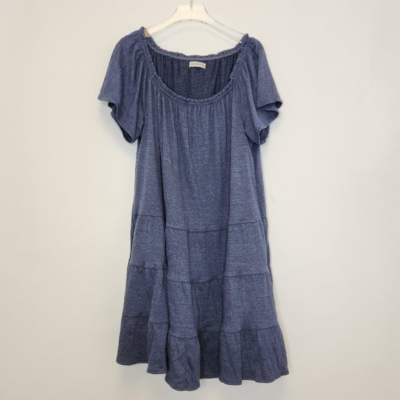 Max Studio Tiered Sun Dress Large Blue Scoop Neck Flutter Short Sleeve Stretch