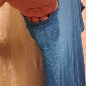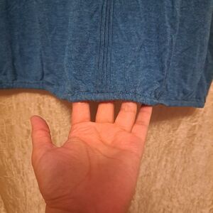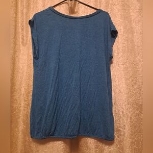This is a never worn top without tags. I thought I'd wear it someday, but never did. Very short sleeves, peek-a-boo hole above chest, elastic waste, feels soft, large, and can be worn with jeans or dress pants or with or without a blazer! super fun to play around with.