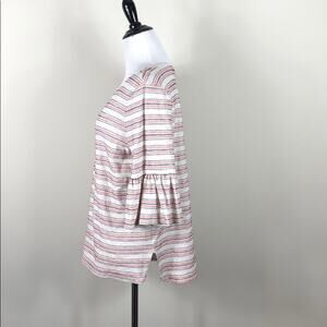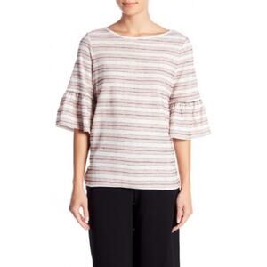 Max Studio topstitched ruffle bell sleeve shirt. Cream, red, and black. Crew neck, elbow length sleeves, vented hem. 88% cotton, 12% polyester. New with tags.