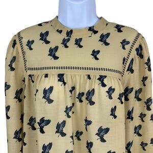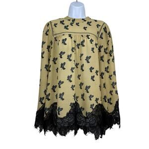 Max Studio Top Women Tan Black Lace Trim Crow Print Whimsigoth Witchy Boho Sheer
