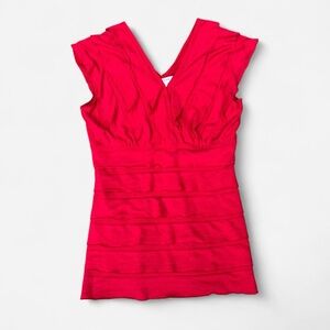 Sleeveless V-neck camisole with fitted ribbed body. Stretch knit sculpts the waist. Red color adds bold style. Easy layering piece for casual or dressed-up looks.