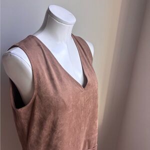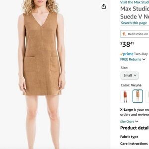 Chic suede mini dress with V-neck. Features front pockets. Perfect for versatile styling.