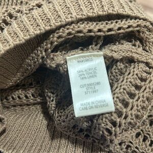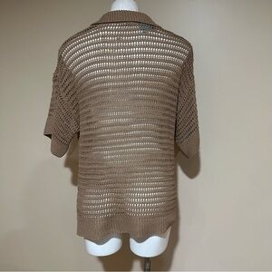 Effortlessly chic crochet-style knit top in a neutral taupe shade.