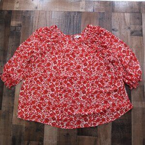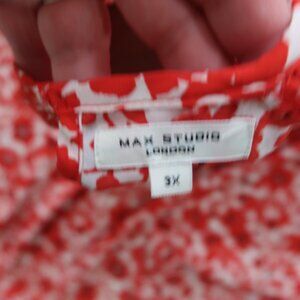 Max Studio womans size 3X red floral 3/4 sleeve blouse with a keyhole back and ruffle detail on the upper sleeve/bodice area.