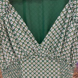 This Max Studio midi dress in size Small features a charming green and white daisy floral pattern on lightweight polyester. It has a flattering deep V-neckline, flutter sleeves, and back and partial side smocking to define the waist while maintaining a flowy, feminine silhouette. The gently ruffled hem and airy design make it perfect for spring or summer occasions. The midi length adds elegance, while the daisy print and babydoll-inspired fit tap into a nostalgic Y2K and cottagecore vibe.