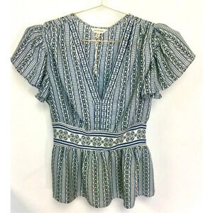 Max Studio Women Small Flutter Ruffle Sleeve Blouse Blue Tulip Print V Neck NWT