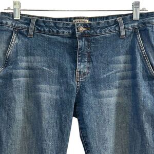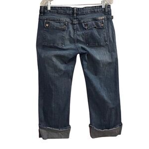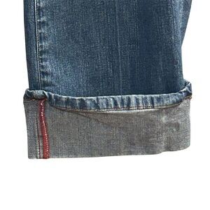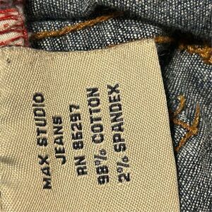 Max Studio women's ankle jeans in size 12 feature a dark wash and a mid-rise fit with a 32.5" waist. Made from 98% cotton and 2% spandex, these jeans offer comfort and flexibility. The design includes a 5-pocket style, button and zip closure, and a cuffed hem. The inseam measures 25". These pre-owned jeans are in excellent condition. Keywords: Max Studio, women's jeans, size 12, dark wash, ankle jeans, mid-rise, denim, 5-pocket, cuffed hem, pre-owned, excellent condition.