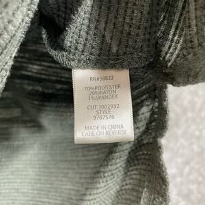 Women's casual knit top by Max Studio. This gray top has 1/2 length ruched sleeves, a seamed waist, and a boxy fit. It is a polyester, rayon, spandex blend.