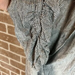 Chest measures 21 inches and length of 27 inches. Size tag is missing but measures as a medium. Linen blend black-and-white pinstripe cardigan. Questions? Leave a comment below!