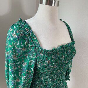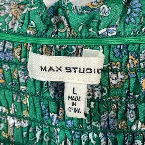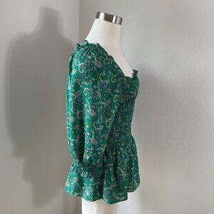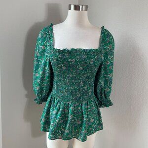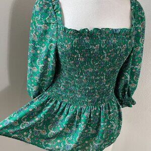 Max Studio Womens Large Green Floral Smocked Peplum Top Square Neck Blouse Shirt