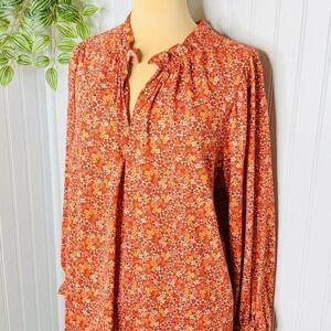 Max Studio Womens Plus Sz 1X Ruffle Neck Top Red White Floral Long Sleeve BOHO