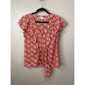Max Studio Womens Red Orange Floral Wrap Tie Blouse Size M Lightweight Short Sleeve Top