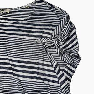 Add a touch of timeless style to your wardrobe with this pre-owned Max Studio striped top in excellent condition. Featuring a classic navy and white horizontal stripe pattern, scoop neckline, and trendy tie details at the sleeves, this relaxed fit tee is perfect for everyday wear or weekend outings. The lightweight jersey knit offers comfort and breathability, making it an effortless addition to your casual rotation.