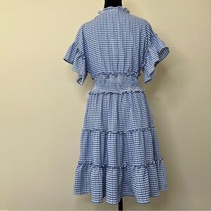 Embrace the charm of cottagecore with this Max Studio blue gingham dress. The smocked waist offers a flattering silhouette, while flutter sleeves and a tiered ruffle skirt add a playful, feminine touch. Perfect for garden parties, casual outings, or those Instagram-worthy moments.