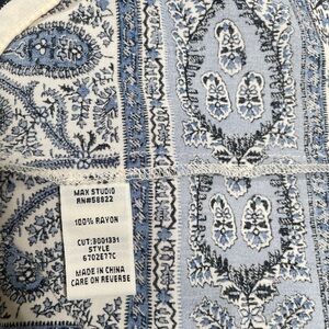 This Max Studio sleeveless tank top features a beautiful blue paisley pattern with tasseled accents, perfect for a bohemian-inspired look. Made of rayon material, this top is comfortable to wear and has a V-neckline. It is available in size M and is suitable for regular size types.