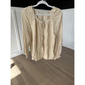 Max Studio Womens Tan and White Striped Loose Fit Keyhole Peasant Blouse Large