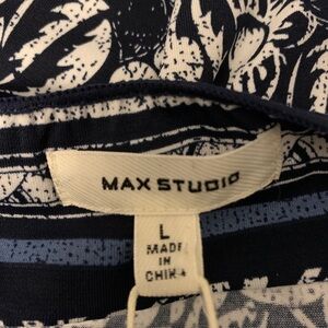 Max Studio sleeveless printed matte jersey trapeze top, neck detail, border print