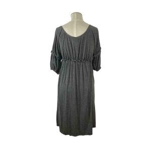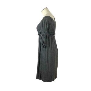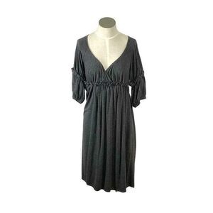 Comfy charcoal gray rayon jersey dress with surplice neckline and ruffled/gathered empire waist and ruffled/gathered raglan balloon half sleeves. Wear by itself on a warm day or layer over leggings or jeans.