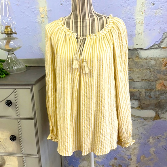 Size small. Loose fit. Tan white striped with ruffled sleeves. No stains or tears
