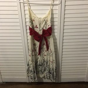 White dress with black and red flowers. Size small. Ties in the back. No zipper or buttons. Comfortable and soft.