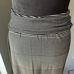 Max Studio maxi skirt, size small. Black and grey horizontal stripes with a fold over waistband. In good used condition, no rips tears or stains. 73% rayon, 22% polyester, 5% spandex.