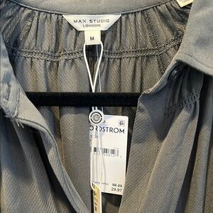 This relaxed button-down shirt by Max Studio features a notched collar and short cuffed sleeves. Its lightweight fabric and buttoned design make it a versatile addition to any wardrobe.