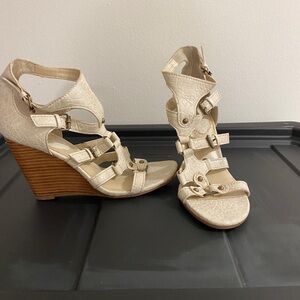 Ivory croc embossed; adjustable ankle buckle; 4” wedge heel