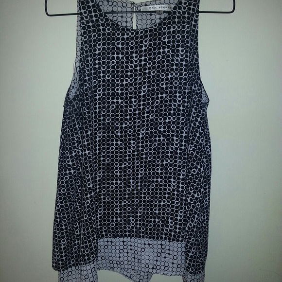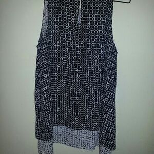 2 layer black and white polka dot blouse looks great with jeans, pants or a skirt. Mother of pearl button at back of neck.