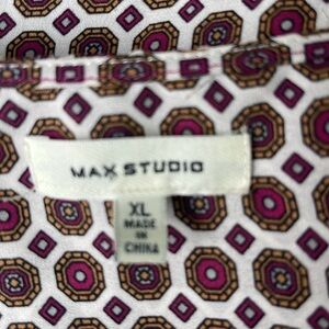 Max Studio - v neck balloon sleeve wrap top - high low hemline - front waist elastic - elastic at sleeve wrist - pattern of light cranberry, rust, gray and off white - great for travel - in good pre owned condition- size XL