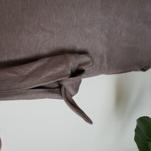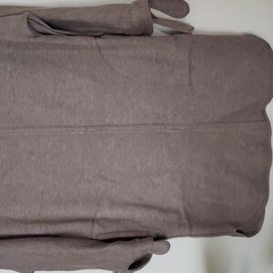 Max Studio weekend light brown beige fleece sweatshirt dress, 3/4 sleeve, ties at sleeve hem, boat neck, so soft and cozy, dolphin hem, two pockets, oversized. Amazing condition, like new, no flaws. Sz Small
