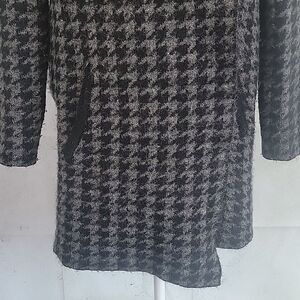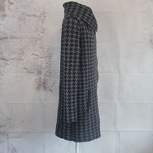 Great for layering a long silhouette cardigan sweater by Max Studio in a grey and black houndstooth pattern featuring a one button closure wrap with high collar, hand pockets, and a straight hemline. Great pre-owned condition with normal signs of wash and wear.