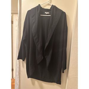 Lays very nicely, not sure how to describe but the waterfall drape part almost makes a sort of hood look in the back. Very versatile piece, comfy and flattering :)