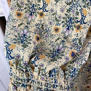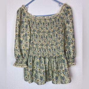 Truly lovely butter yellow with tiny flowers in chiffon and stretchy bodice. Peasant Cottagecore hippie vibes. Sleeves sheer bodice is not. Can wear on or off shoulder. Elastic square neckline delicate ruffle. Pit to pit 14”. - 19” fits me I’m a M/L easily. Shoulder to hem 24”. Like new no wear or flaws.