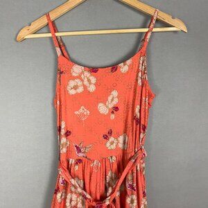 Max colorful summer midi dress with a floral and hummingbird design. Peachy/orangish-pinkish color. Spaghetti straps. Elastic at upper back for ease of fit. Pockets at side seams. 100% Rayon.
