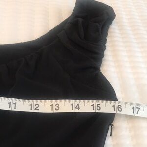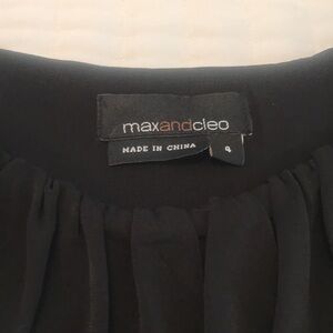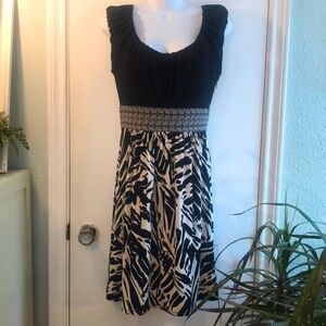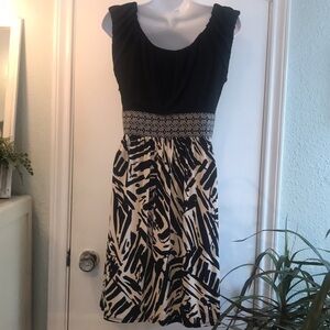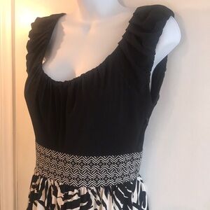 Max and Cleo black printed dress, scoop neckline in front and back, sleeveless with gathers around the neckline and sleeves, hidden side zipper, wide waistband for slimming effect, 96% poly, 4% spandex, in great condition.