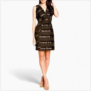 DETAILS: Fully lined with back zip close. Fitted sheath style with wrap look, pleated neckline. Has a striped pattern in brown tones with satin, velvety and nubby novelty textured fabrics.