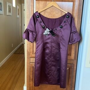 Gorgeous cocktail dress by Max and Cleo it is new with tags. The color is between maroon and eggplant the sleeves have classy ruffle details and there is beautiful black accents around the top. Would also make a great prom dress.