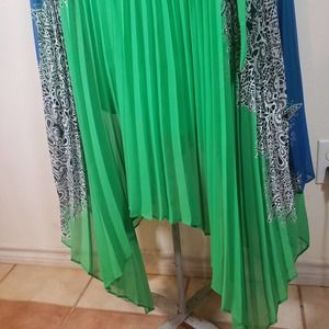 Max and Cleo blue and green sleeveless, racerback dress with accordion pleats. So many beautiful details! Lined. Boning in the top area. With a belt and zips up back. Zig zag handkerchief style hem along the bottom. Gorgeous! Measures 18.5" across pits. 15" Across waist and about 47" long from top of shoulder to long part of hem. All Polyester. Excellent condition and almost like new. Nonsmoking home with awesome pugs.
