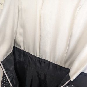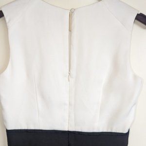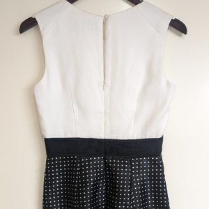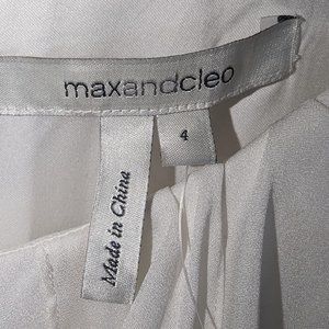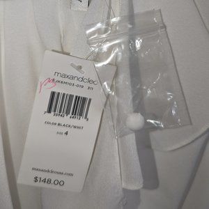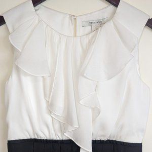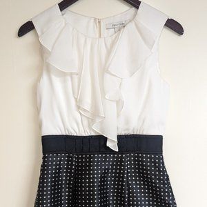 Gorgeous black and white Max and Cleo dress. Sleeveless top features soft ruffles in all white. Rouched black waist gives good definition and transition to black and white polka dot fitted bottom skirt. Back features single button closure and neckline with keyhole opening leading to zipper closure. 100% polyester. Top is soft and flowing while bottom is sleek and sexy. Best of everything! New with Tags. Includes replacement button.