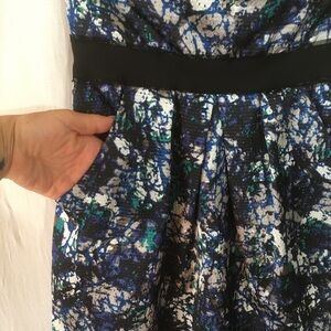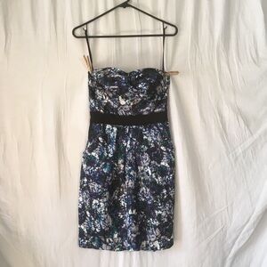 Max and Cleo strapless mini dress with pockets in a textured silky abstract floral pattern, ruching at the breast and a cute ribbon around the waist
