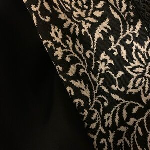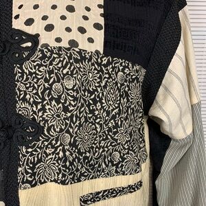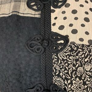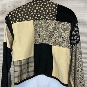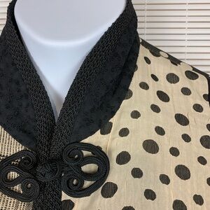 Max and Mable vintage mixed fabric Asian inspired jacket. Beautiful knot button detailing on front. Lightweight. Fully lined. Unique! Size is approximately a large. Size 1. See measurements for sizing.