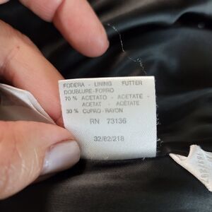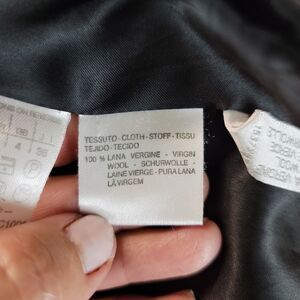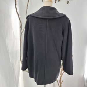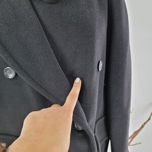 The softest wool pea coat you will ever feel. Jacket is a slouched fit with wrist length sleeve. No flaws in lining. Only flaw is the indentation from small snap buttons. Shows in last picture. It's labeled Max mara size 2 but I am a large with hips and butt and can fit it no problem completely buttoned up. Will add measurements