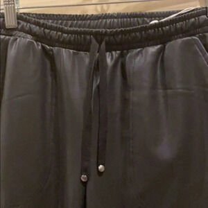 Drawstring pants in stylish faux leather elevate your work from home outfits while maintaining perfect comfort Elasticized drawstring waist - Pull-on style - Side slash pockets - Faux leather construction - ContentFaux leather: 100% polyurethaneCareMachine wash cold gentle, line dry