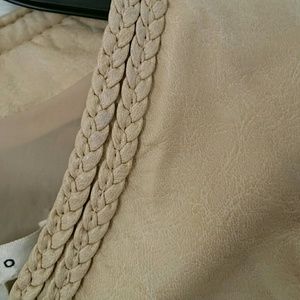 Faux leather in great condition. Has cool braided detail on the leather.Hits right above the knee zipper in back has faint marks on top near collar