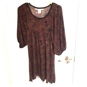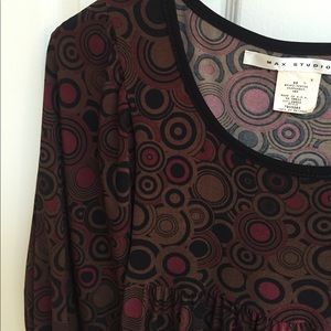 Max studio geometric black maroon dress. Flowery and comfortable with batwing arms. Polyester material with some spandex to keep its shape. Euc. Was my go to for one season with boots during the winter. Ask questions. Sized xs but can fit from xs to small or sized 4-8. Will list as small. 36"L. 15” pit to pit but with stretch. I am a 36b and it works