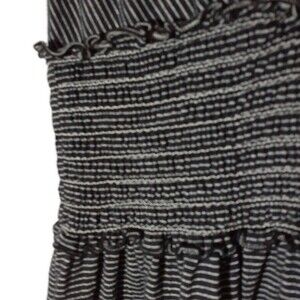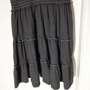 this dress is an excellent condition. it is black with tiny white lines running horizontally. it has ruffle details and many layers. size small. great comfortable everyday dress for summer #summerdress #bohemian #hippie #lagenlook #romantic
