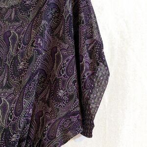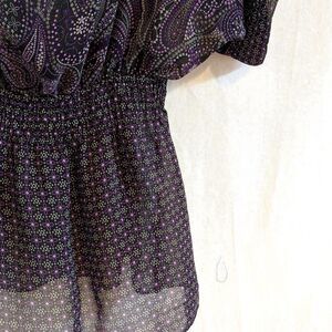 Max Azria teamed up with Miley Cyrus to make a limited clothing line. Black and purple sheer chiffon dolman sleeve top with elastic waistline. Two prints. Size Large